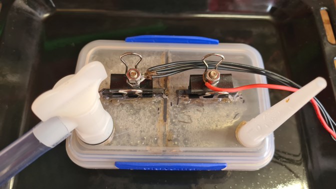 Electrodes went through the lid and hot glue was used just to seal gaps between them and the lid. The one remaining seriously glued part was the perspex partition to separate the oxygen and hydrogen chambers. Also to prevent another over-heating surprise, we’ve filled the baking tray with a coolant (fancy name for traditional H2O). Full of optimism – we connected whole device in electricity.