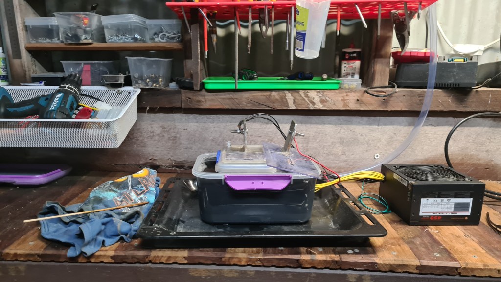 So what you see here is a single 3l container, filled with electrolyte, where there is another Systema container in it, which is missing its bottom. Also you can notice that we’ve reverted back to our stainless-steel electrodes as those graphite-ones were literally being eaten (on cathode). See picture below which shows how 4mm looks like after 4hrs.