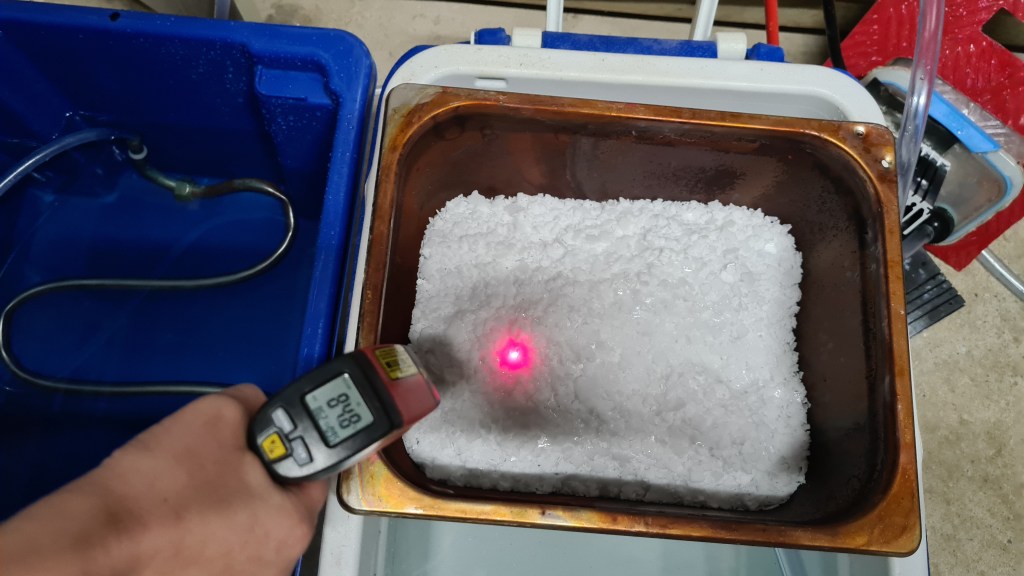 Adding water to ~2kg of KOH we’ve witnessed a beautiful exothermic reaction again reaching and measuring it with our thermometer we’ve been able to get values even over 120C. Beautiful.