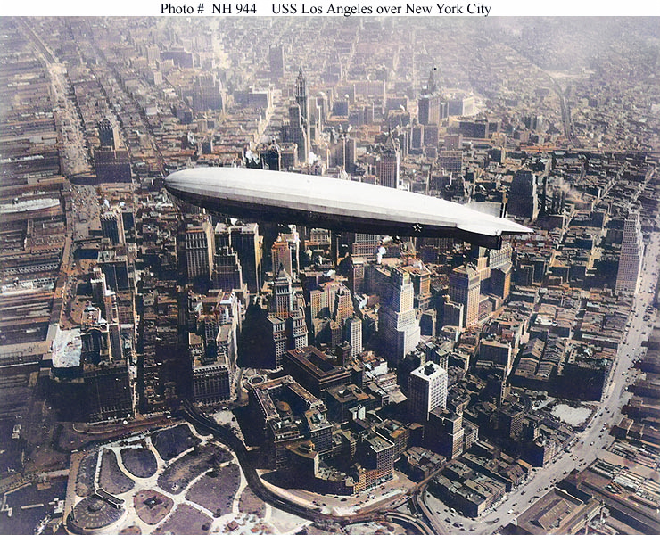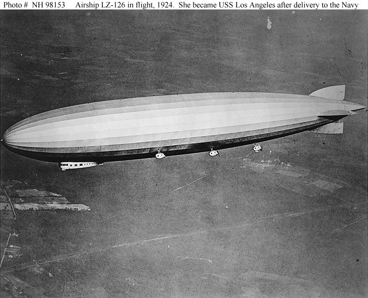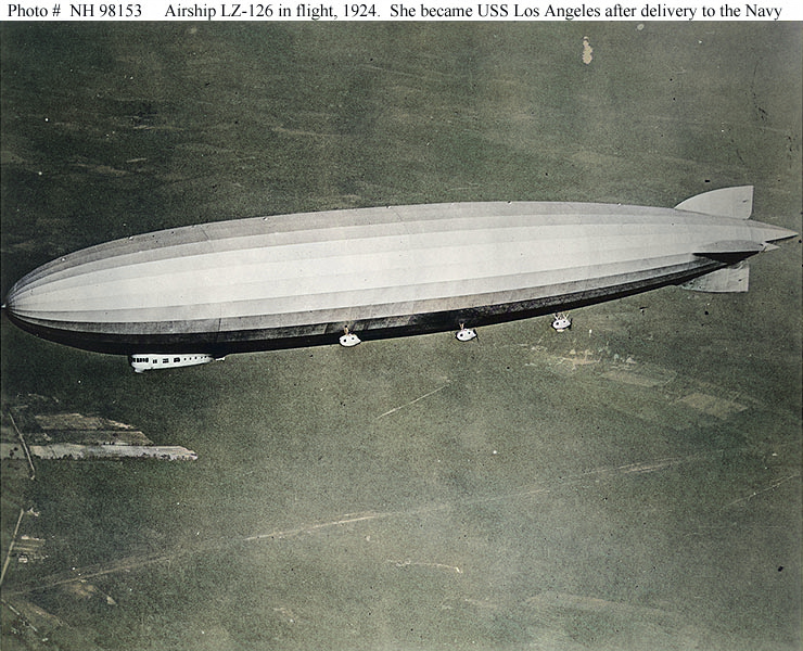 USS Los Angeles, a 2,472,000 cubic foot rigid airship was built at Friedrichshafen, Germany. Her construction was partially funded by German World War I reparations and was conditional on her being employed for “civil” purposes. Completed in August 1924 under the builder’s number LZ-126, she departed Germany in mid-October 1924 for delivery to the U.S. Navy. After a three day trans-Atlantic flight, the airship arrived at Naval Air Station Lakehurst, New Jersey, where her hydrogen lifting gas was replaced with non-flammable helium. This greatly increased her safety, but also significantly reduced her payload and range. In late November 1924 she was placed in commission as USS Los Angeles and began several years of flight activity to explore the potential of her type for commercial and Naval use. Between February and May 1925, she voyaged twice to Bermuda and one time to Puerto Rico, and made test moorings to the Navy’s floating airship base, the oiler Patoka.