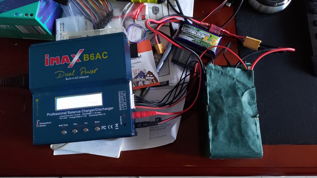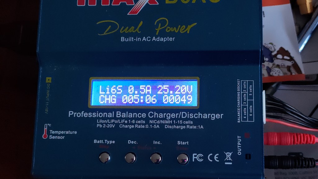 Richard then first did Balance on battery, and then charged 1A 6S. After checking voltage he sees it drop quickly to 24V. Now he restarted charging at 0.3A, low and slow to get more capacity before it gets destroyed on a 1A discharge cycle to determine new capacity.