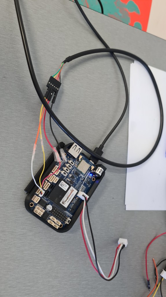 Next day I dedicated morning to some taping-magic (there was no time for proper soldering) and I was able to connect it with our BBB through the JST-SH connector which coincidentally arrived to Sebi a day before (it was on its way from China for a month). I am not proud of it, but here comes a picture whilst it is already connected.