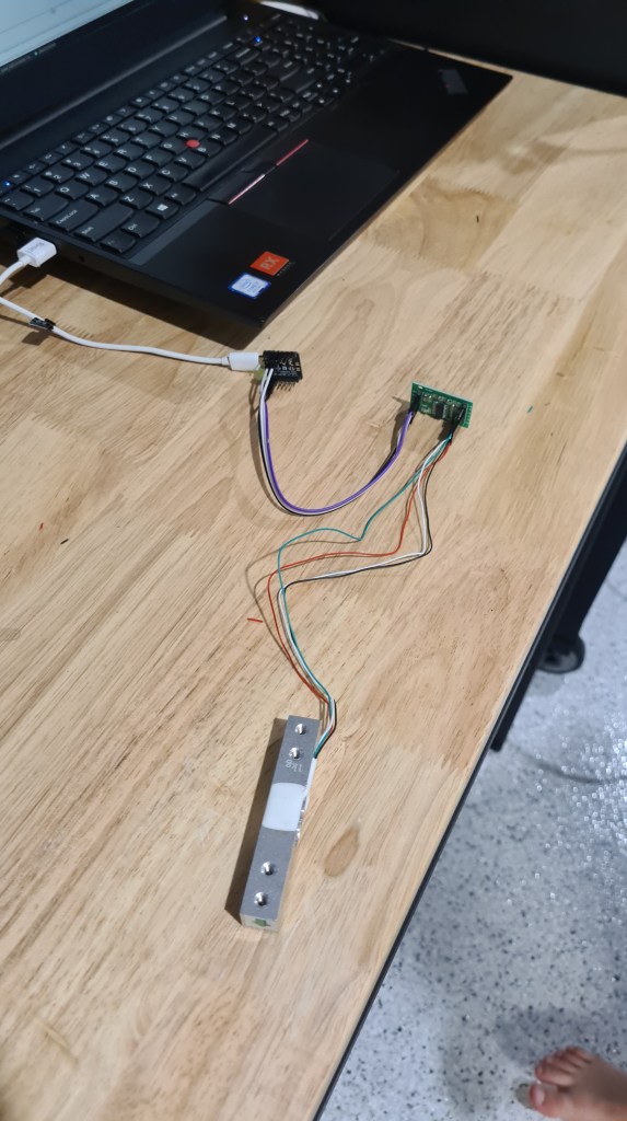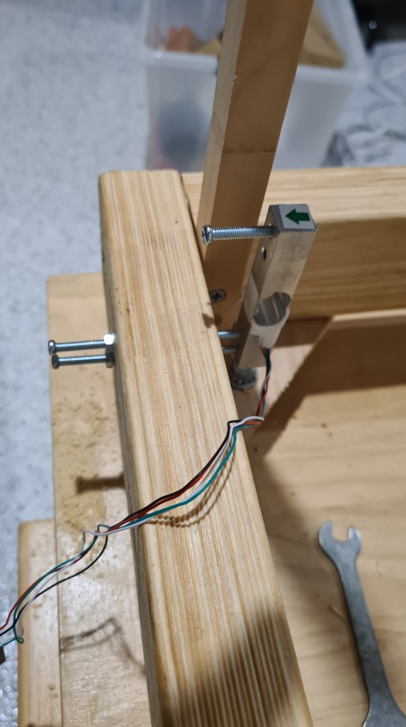 Sebi prepared a setup to give it a go. That aluminium thing is our load cell, it is connected to an amplifier, which is connected to some ArduinoNano and all that chain ends in Sebi’s laptop through USB. Each load cell comes with an arrow showing direction in which forces should be applied.