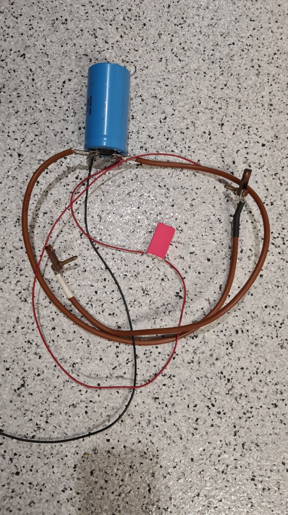 As you can see, it is just a simple-huge capacitor with a resistor to shield it from crashing a power source. Risa invited me to demonstrate how it is working and while it was giving super-cool sparks results didn’t make me confident that this is a way to go.