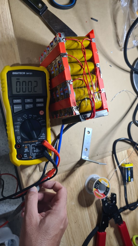 … checking a voltage on the first one shows 25.2V and the second one -25.2!!!! Well it took us 15 minutes to rewire everything and solder it together again, but all good now – working resistance is down to 0.2Ω.