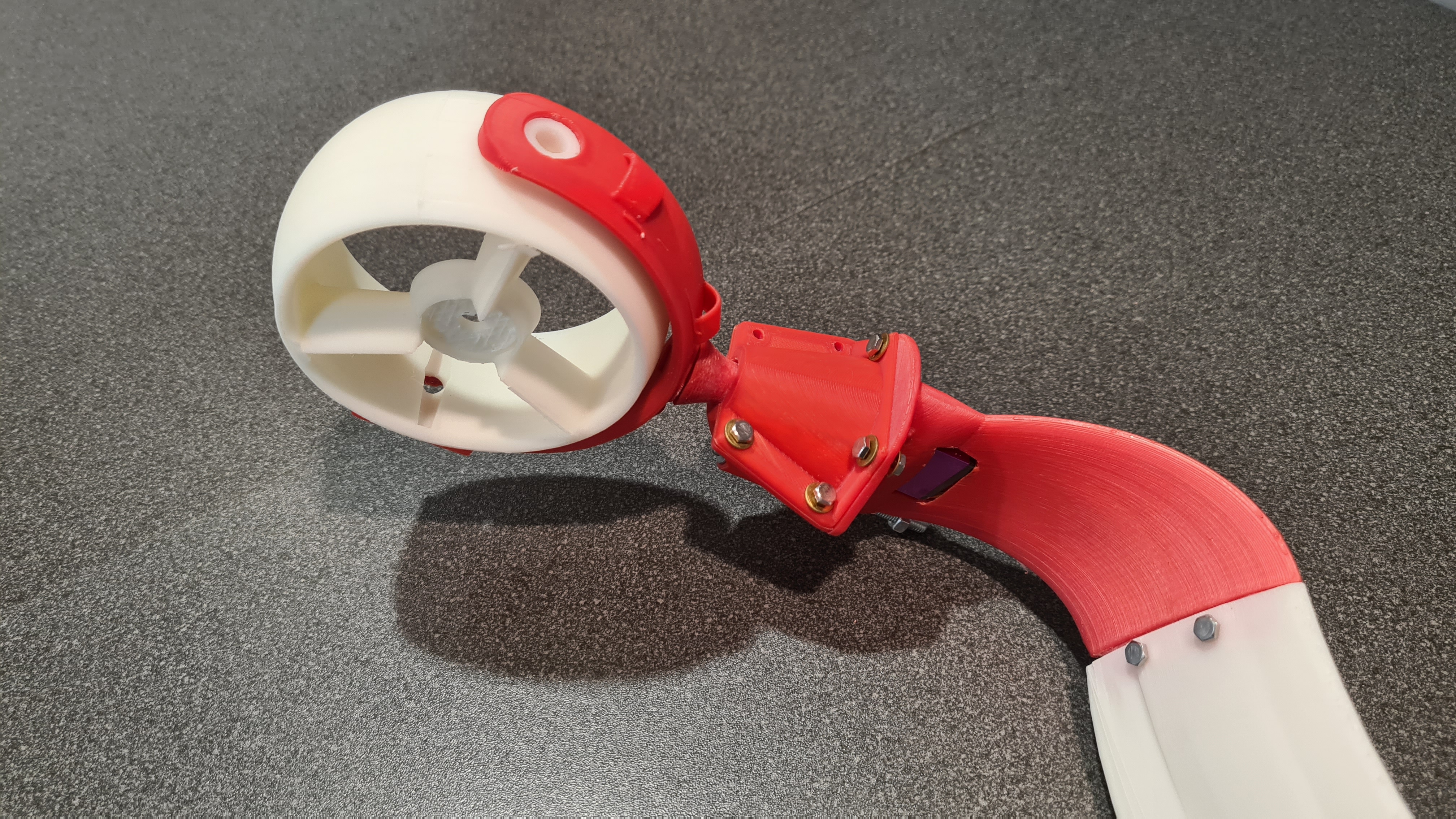 When having that above mid-section in hands, designing this part was much easier. Practically the same, but smaller + bit of fun when scaling cylinders to make them fit that ellipsoid cross-section. Problematic part came when attempting to join it with the gimbal as there was not enough material to make me confident about it withstand some reasonable sheer forces (400N). Simple “test by Ondrej” demonstrated that I was right.