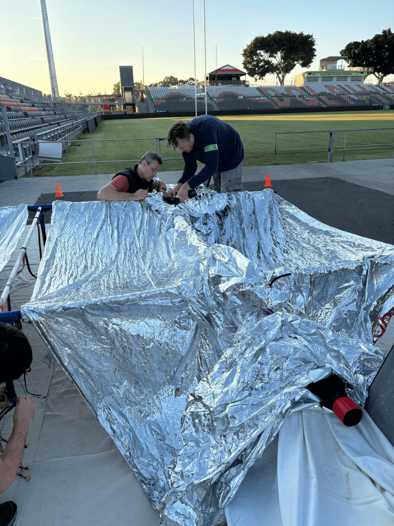 Early birds Mick Cullen and I started unloading gear well before sunrise. By 7:00 AM, the assembly area was alive. Sheets laid out, ducts inserted, envelopes unfurled.