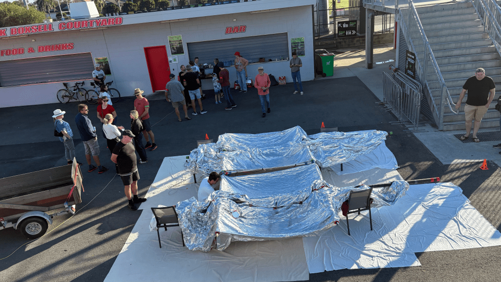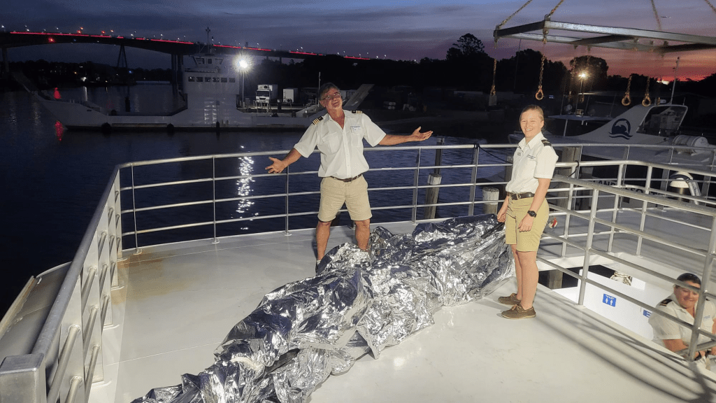 The Reef Cat ferry had found it. After a bit of detective work, we connected with their crew and raced to the docks. The captain—delighted by his silver catch—posed for a photo, called it a UFO, and joked about tracking down Greg Williams in WA. They helped us unload the airship, shared GPS coordinates, and even offered photos and videos of the rescue.