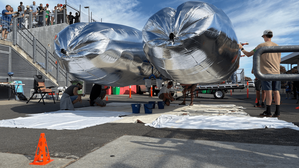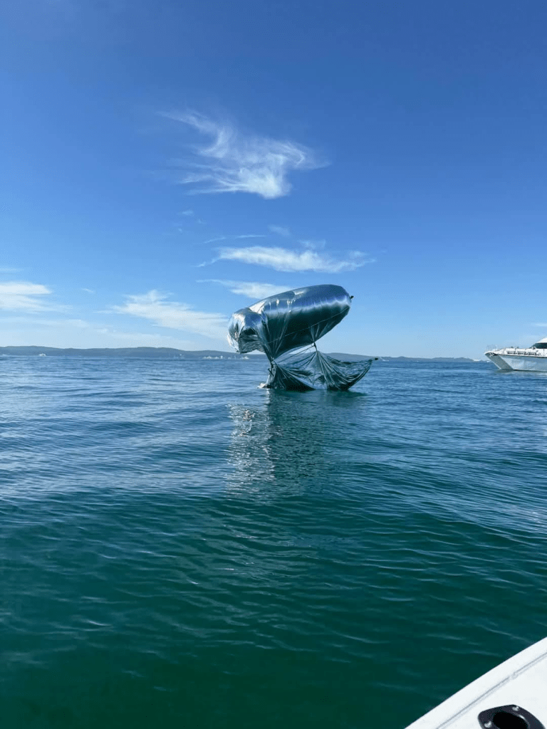 At a low-key afterparty in Scarborough, the call came in. Kristian had seen a Facebook post: “Things ya find in the bay?” There it was—our airship, one envelope deflated, bobbing on the water.