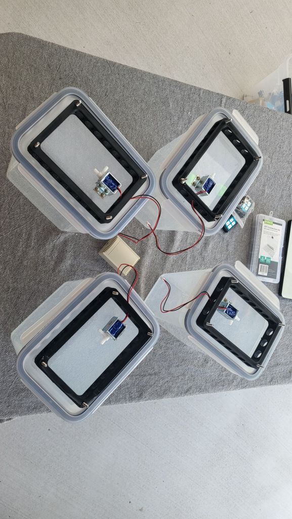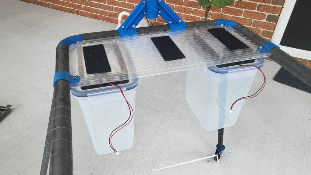 Each tank system consists of a plastic container mounted to the gondola platform, featuring a normally-closed solenoid air valve at the top and an always-open water release valve at the bottom. Water release is only possible when air is let in through the solenoid, effectively controlling when and where weight is shed.
